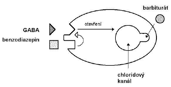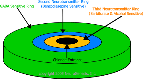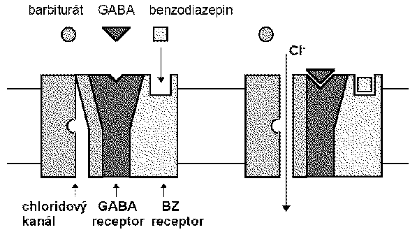 Se distinguen dos tipos de receptores GABAérgicos: el GABAA, postsináptico, y el GABAB, presináptico. El receptor GABAA es una estructura compleja que incluye al receptor GABAérgico propiamente dicho, al receptor endógeno de las benzodiacepinas y el canal iónico que, como neurotransmisor inhibitorio, es un canal de cloro (Cl-), así como la GABA-modulina, una proteína de enlace entre las estructuras principales, es decir, ente el receptor GABA y el receptor benzodiacepínico. La GABA-modulina bloquea inicialmente a los receptores e inhibe el canal iónico de Cl-; cuando esta proteína deja de actuar, ambos receptores se complementan abriendo el canal del Cl-; si alguna benzodiacepina (BZ) actúa sobre los receptores, se produce un incremento en la capacidad receptiva del propio GABA-receptor.