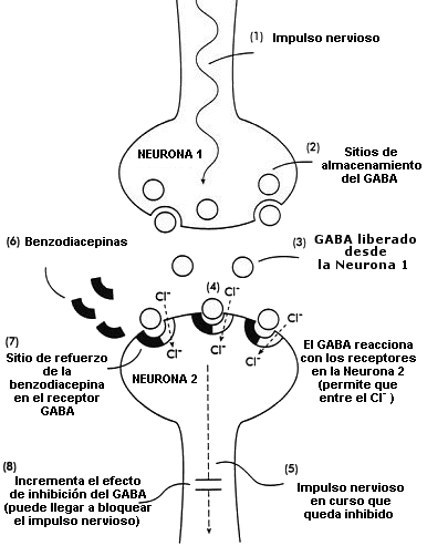 El ácido gamma-aminobutírico es el neurotransmisor inhibidor de mayor proporción en el snc. estudios eléctricos concluyen que las bzd potencian la transmisión de las neuronas gabaérgicas, incluyendo la médula espinal, corteza del cerebelo, hipotálamo, hipocampo, substancia nigra etc. las bzd incrementan la eficacia de la inhibición gabaergica en la sinapsis (vía hiperpolarización de inhibición gabaergica en la sinapsis ( vía hiperpolarización de membrana), las bzd no substituyen el gaba, más bien incrementan los efectos gaba sobre la activación del receptor asociado con el canal de cloro.
