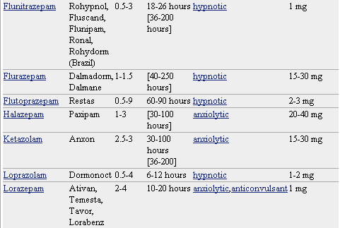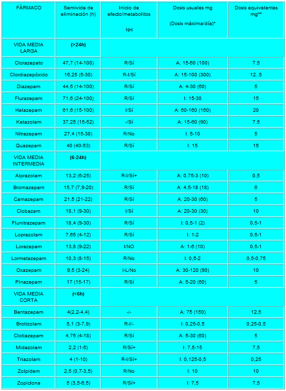Pero lo que diferencia marcadamente a este grupo de medicamentos entre sí es la velocidad de eliminación. Sus vidas medias de eliminación - t1/2- varían en un amplio rango (de 2 a 100 horas) y algunos presentan metabolitos activos. La posibilidad de efectos residuales tras dosis únicas y efectos acumulativos tras administración de dosis múltiples debe considerarse, especialmente en pacientes ancianos. Las bdz potentes con tt/2 relativamente corto (triazolam, alprazolam, lorazepam) parecen causar un mayor riesgo de dependencia. Existen numerosas bdz comercializadas en nuestro país que se clasifican en función de su semivida de eliminación. En la TABLA I, (verlo más abajo)se muestra esta clasificación y se indica el tiempo de inicio del efecto, la existencia/no de metabolitos activos, las dosis usuales con el máximo recomendado, y las equivalencias en mg entre distintos principios activos para su sustitución.