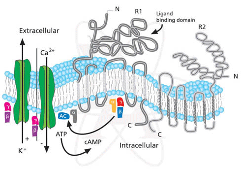 Los receptores GABAB están asociados a una proteína G inhibitoria, disminuyendo los niveles intracelulares de AMP cíclico, que produce cambios en la permeabilidad de canales catiónicos, aumentando el influjo de iones potasio y el flujo al exterior de iones sodio. Los receptores GABAB se encuentran en su mayoría en membranas postsinápticas donde cumplen la función de heterorreceptores.
