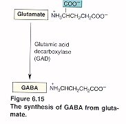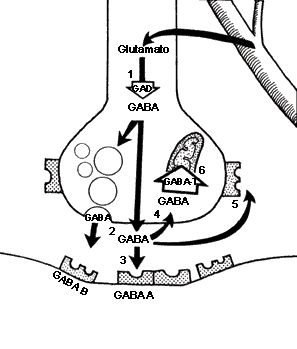 El GABA es sintetizado a partir de la descarboxilación del Glutamato, mediada por la enzima Glutamato Descarboxilasa (GAD) que tiene como coenzima el piridoxal fosfato (forma activa de la vitamina B6). Una vez sintetizado, el GABA es introducido en vesículas y está listo para salir de la neurona presináptica. Cuando se produce el estímulo nervioso, GABA es liberado de la neurona presináptica y llega hasta la neurona postsináptica donde es reconocido por los receptores GABAA y GABAB. El GABA que no interacciona con los receptores es recaptado bien sea por la célula presináptica o por las células gliales. Una vez allí, mediante la GABA Transaminasa es degradado el GABA a ácido succínico semialdehído que la Succínico semialdehído deshidrogenasa (SSADH) lo convierte a ácido succínico. La glutamato descarboxilasa se halla en interneuronas, riñón, hígado, páncreas, ganglios autónomos, epífisis e hipófisis posterior; mientras la distribución de la GABA aminotransferasa es similar a la MAO: mitocondrias, médula espinal, nervios craneales, cerebelo, células gliales y células ependimarias productoras de líquido cefalorraquídeo.