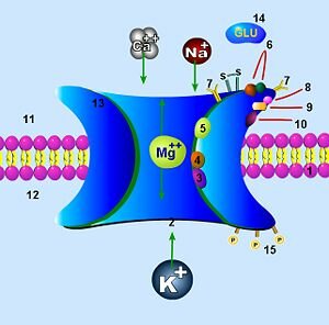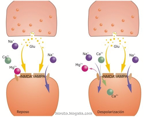 Durante la transmisión sináptica normal, el glutamato (Glu) se libera desde el botón presináptico y actúa tanto sobre receptores AMPA (rAMPA) como NMDA (rNMDA). Sin embargo, el Na+ fluye solamente a través de rAMPA, pero no de rNMDA, porque el Mg2+ bloquea el canal del rNMDA. La despolarización de la célula postsináptica libera el bloqueo del rNMDA por el Mg2+, permitiendo fluir dentro de la espina dendrítica al Na+ y al Ca2+ a través del rNMDA. El aumento resultante del Ca2+ dentro de la espina dendrítica es crítico para la puesta en marcha de la una de las formas de memoria.
