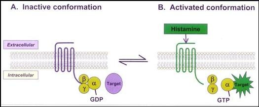 Hasta el momento actual se han encontrado 4 subtipos diferentes de receptores para Histamina en humanos (H1, H2, H3 y H4). Los 4 subtipos pertenecen a la familia de GPCRs. Son proteínas integrales de la membrana y están formados por una cadena en forma de serpentina que entra y sale 7 veces de la membrana. En su extremo extracelular se encuentra el sitio para acoplar al ligando (histamina o agonista o agonista inverso) y en el extremo intracelular se encuentra asociado a una proteína G la cual a su vez está formada por 3 subunidades (alfa, beta y gamma) las cuales se pueden asociar (abg) o disociar (a - bg) dependiendo de la actividad del receptor. Acoplado a la subunidad alfa se encuentra una molécula de GDP de baja energía que se puede fosforilar a GTP de alta energía cuando se disocia la subunidad alfa del heterodímero beta/gamma y actúa sobre una enzima “blanco”.