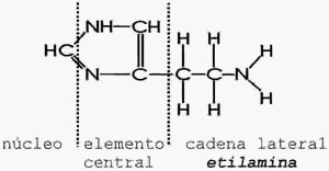La histamina es una amina primaria derivada del imidazol. Es una amina biógena que se encuentra ampliamente distribuida en las mucosas del tracto gastrointestinal y respiratorio, así como en la piel. La mayor fuente de histamina en el cuerpo humano son los mastocitos tisulares, lo que da origen a su nombre actual que deriva de la palabra griega histos = tejido. Esta se almacena en forma inactiva dentro de los gránulos basófilos de los mastocitos tisulares y leucocitos circulantes. En respuesta a ciertos estímulos, tales como un daño epitelial producido por venenos o toxinas, estas células liberan histamina, que inmediatamente produce la dilatación de los vasos sanguíneos, es decir, una reacción inflamatoria.