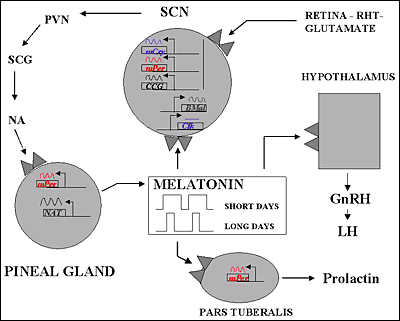 La secreción de melatonina desde la glándula pineal queda inhibida por la luz brillante, por lo que la menor concentración de melatonina sérica se observa durante el día. Al comienzo de la noche, hay un incremento en la liberación de noradrenalina que activa los b-adrenoceptores de la glándula pineal para aumentar la formación de AMPc y con la activación de los a1-adrenoceptores se amplifica más la respuesta. Este segundo mensajero provoca la activación de la serotonina N-acetiltransferasa que va a incrementar la síntesis de melatonina. Existen dos subtipos de receptores de melatonina, MT1 y MT2, ambos están acoplados a proteínas Gi/o. Por medio de la utilización de receptores recombinantes se ha observado que MT1, por su actuación por medio de proteínas G produce la inhibición de la adenilato ciclasa y, por otra parte, produce la activación de la Fosfolipasa C. Mientras que MT2, además dela inhibición de la adenilato ciclasa produce la inhibición de la ruta de la guanidil ciclasa. Todo ello sucede una vez que la melatonina se una a sus receptores. Por tanto, la glándula pineal funciona como un transductor neuroendocrino. En mamíferos, la información fotosensorial que entra por la retina influye en la actividad de sus proyecciones neuronales, que sirve finalmente para inhibir o estimular la secreción de serotonina. En animales aislados en oscuridad continua el ritmo circadiano de secreción de melatonina. La síntesis de melatonina se lleva a cabo desde un reloj endógeno, probablemente situado dentro del núcleo supraquiasmático del hipotálamo, habiendo sido entrenado normalmente en el ciclo día-noche.