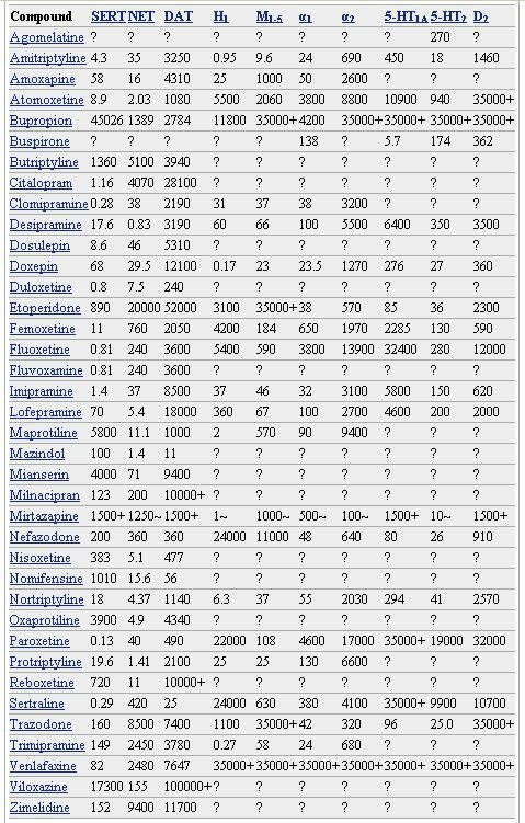 Para comparar de forma gráfica la afinidad de diferentes antidepresivos ir a --> búsqueda taxonómica de esta web.