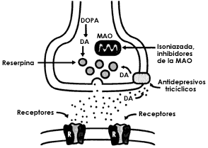 Los nuevos fármacos IMAO actúan sólo sobre una fracción de la enzima MAO, por lo que se hallan libres del riesgo de provocar una crisis hipertensora. Pero la eficacia ha descendido en ellos casi en la misma medida que su seguridad resulta elevada. Los neurotransmisores sobre los que actúan los antidepresivos son la noradrenalina o norepinefrina (NA), la dopamina (DA, precursora de la noradrenalina), la serotonina o 5-hidroxitriptamina (5HT) y la acetilcolina (ACH). Recordemos que la hiperactividad colinérgica se asocia con la depresión endógena y que la administración de agonistas (estimulantes) colinérgicos implica la aparición de sintomatología depresiva. Sobre la acetilcolina ejercen una acción antagónica importante varios antidepresivos clásicos, los denominados antidepresivos tricíclicos, mediante el bloqueo de los receptores postsinápticos colinérgicos muscarínicos. Esta acción representa a la vez un factor terapéutico, que permite a estos productos lograr efectos especialmente eficaces frente a las depresiones más rebeldes, y una desventaja, al ser una fuente de efectos secundarios indeseables (boca seca, visión borrosa, estreñimiento, retención de orina).
