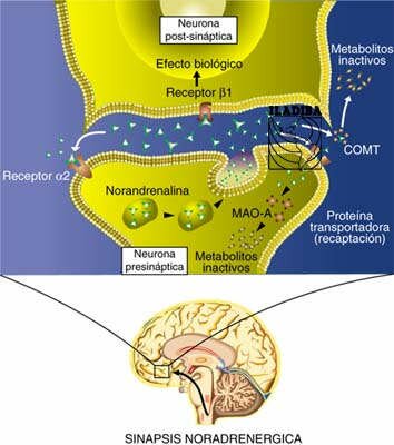 Sinapsis noradregérgica. La norepinefrina (noradrenalina) activa la neurona postsináptica y después, la COMT (catecoloximetiltransferasa) transforma la norepinefrina en normetanefrina. Además es recaptada por la neurona presináptica. Cuando se libera la Norepinefrina: Actúa sobre el receptor postsináptico. Actúa sobre el receptor presináptico (ponen en marcha un mecanismo feed-back negativo y frena la liberación de nueva norepinefrina). La COMT degradaría la norepinefrina. La MAO (monoaminooxidasa) rompe la norepinefrina que se libera en las vesículas presinápticas. Cuando se libera hay más norepinefrina. Los inhibidores de MAO son los IMAO.