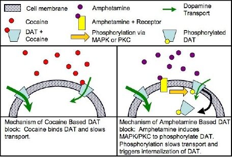 La cocaína se une directamente al transportador DAT1, inhibiendo la recaptación con más eficacia que las anfetaminas que fosforilan el DAT, causando la internalización del DAT (que la cocaína no lo hace) y sólo la inhibición de su recaptación como secundaria, es mucho menor el modo de acción que el de la cocaína, a partir de la conformación opuesto / orientación al DAT.