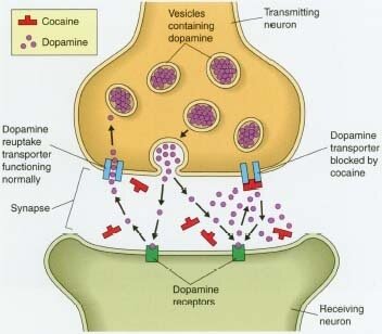 La farmacodinamia de la cocaína involucran las complejas relaciones de los neurotransmisores (inhibiendo la captación de monoaminas en ratas con una relación cercana a: serotonina:dopamina = 2:3 serotonina:noradrenalina = 2:5 [54]) El efecto más estudiado de la cocaína en el centro sistema nervioso es el bloqueo de la proteína transportadora de dopamina. el transmisor dopamina liberado durante la señalización neuronal es normalmente reciclado a través del transportador, es decir, el transportador se une el transmisor y lo bombea hacia fuera de la hendidura sináptica de nuevo en la neurona presináptica, en el que se recoge en las vesículas de almacenamiento. La cocaína se une fuertemente al transportador de dopamina formando un complejo que bloquea la función de transportista. El transportador de la dopamina no puede seguir desempeñando su función de la recaptación de la dopamina y por lo tanto se acumula en la hendidura sináptica. Esto resulta en un efecto postsináptico aumentado y una prolongación de la señalización dopaminérgica en los receptores de dopamina en la neurona receptora.