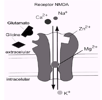 El receptor NMDA es una proteína muy compleja y tremendamente regulada (ver figura). Su conductancia al Ca2+ es notablemente alta y es ésta quizá su característica más destacable y la responsable de muchas de sus funciones. Otra característica especial del receptor NMDA es que para que el canal se abra se necesita, además del glutamato, la presencia de un co-agonista (el aminoácido glicina). Ciertas poliaminas, al igual que la glicina, modulan positivamente el canal, mientras que el cinc y un exceso de protones lo modulan negativamente. Sin embargo, lo más llamativo de este receptor es que comparte características funcionales de canales regulados por ligando y de canales sensibles al voltaje y dependientes de uso. Esta propiedad está relacionada con el bloqueo efectivo del canal del receptor NMDA por el ion Mg2+, cuando el potencial de membrana está próximo al valor de reposo. Este bloqueo es eliminado transitoriamente cuando la membrana se despolariza, por estimulación repetitiva previa, por ejemplo.