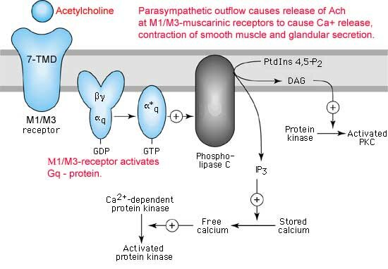 La estructura y función de los receptores muscarínicos colinérgicos son muy distintas de las de los nicotínicos. Se han identificado al menos 5 subtipos de receptores muscarínicos. Los M1 y M2 están formados por 7 segmentos transmembranarios y ejercen sus acciones a través de proteínas G. La activación de M1 ocasiona una disminución de la conductancia para el K+ por medio de la activación de una fosfolipasas C, mientras que la activación de los receptores M2 produce un aumento de la conductancia del K+ por medio de la inhibición de la adenilciclasa. La unión de la acetilcolina a los M1 produce pués una depolarización de la membrana postsináptica mientras que la unión de la acetilcolina a los M2 produce una hiperpolarización