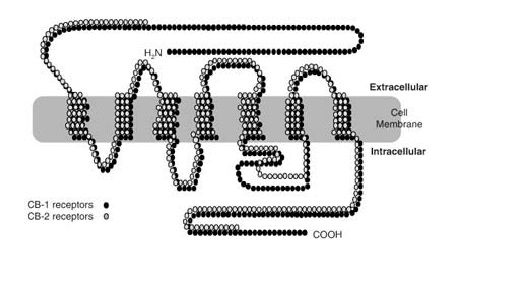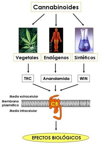 Ahora bien cómo es posible que una molécula de origen vegetal tenga efectos sobre el sistema nervioso central del hombre. La respuesta la proporcionó un laboratorio en EEUU, el cual demostró que el delta-9-THC se acopla a una proteína localizada en la membrana de las células. Este es un receptor que se denominó posteriormente como CB (canabinoides) y la nomenclatura de los receptores se amplió cuando se caracterizaron receptores en el SNC, los cuales fueron llamados CB1; mientras que aquellos que presentaban una distribución periférica en el sistema inmune eran referidos como CB2. Entonces los investigadores se preguntaron por qué una molécula producida por una