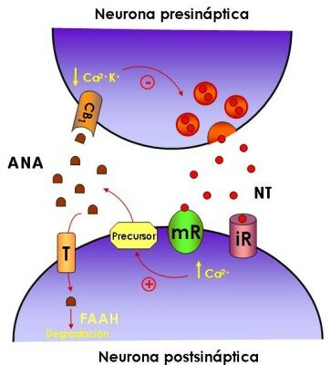 Los endocanabinoides llegan al espacio extracelular y activan los receptores CB1 que se encuentran en ciertas terminales nerviosas. La activación de los receptores CB1 conduce a la inhibición presináptica del GABA o a la liberación de glutamato al inhibir los canales de calcio y activar los canales de potasio. Los endocanabinoides pueden entrar a las células presinápticas o postsinápticas por el transportador de anandamida (AT). Además en las células postsinápticas está presente la FAAH (hidrolasa de amidas de ácidos grasos), enzima que degrada la anandamida y en las presinápticas la monoglicérido lipasa, que degrada el 2-AG.