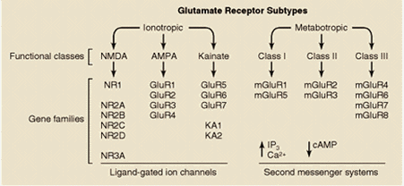 Los receptores NMDA son complejos proteicos formados por diferentes combinaciones de varias subunidades (denominadas NMDAR1 y NMDAR2A-2D). La subunidad NMDAR1 posee todas las propiedades fundamentales necesarias para constituir un canal funcional y puede estar presente en ocho isoformas diferentes. La otra familia de proteínas que contribuye a la formación de receptores NMDA funcionales está constituida por cuatro variantes de la subunidad NMDAR2 (NMDAR2A-2D), codificadas por cuatro genes separados. Distintas combinaciones de la subunidad fundamental NMDAR1 con las otras subunidades dan lugar a receptores NMDA con propiedades funcionales diferentes, que pueden estar distribuidas en áreas encefálicas específicas y/o que pueden definir respuestas fisiológicas o patológicas distintas en respuesta al glutamato.