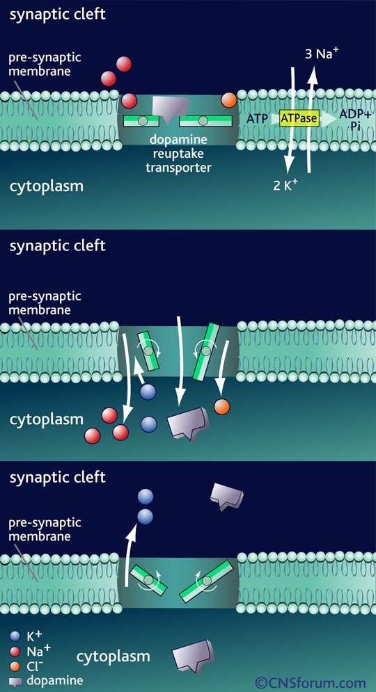 La acción de la dopamina en la sinapsis se termina con su recaptación por la membrana presináptica. Este es un proceso dependiente de energía. Sodio/potasio ATPasa usa la energía de hidrólisis del ATP para crear un gradiente de concentración de iones a través de la membrana presináptica que impulsa la apertura de los transportistas y el co-transporte de iones sodio y cloruro junto con la dopamina a la hendidura sináptica. Los iones de potasio son neesarios para que el transportista pueda volver a la posición externa. Con la liberación de los iones de potasio en la hendidura sináptica se equilibra el gradiente de iones a través de la membrana presináptica. El transportador de la recaptación de dopamina está entonces disponible para unirse a otra molécula de la dopamina para la re-absorción.